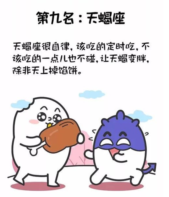 天蠍座很自律,該吃的定時吃,不該吃的一點兒也不碰,讓天蠍變胖,除非天上掉餡餅。