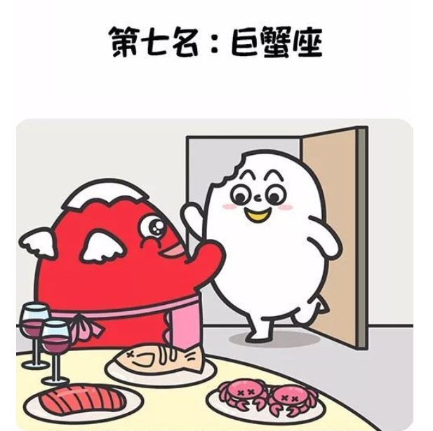 巨蟹可是個大廚,什麼美味都能做出來,不過自己卻不吃,都給了朋友們。所以巨蟹的朋友都很胖,他自己卻挺苗條。